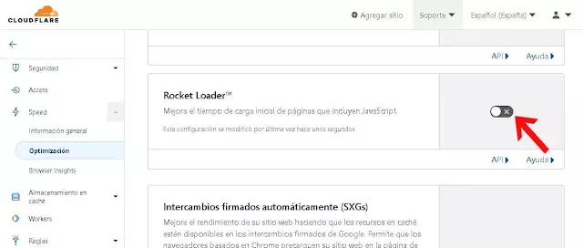 Dentro de la pestaña Velocidad (Speed) de la cuenta de Cloudflare, los usuarios pueden acceder a la sección Optimización para desactivar la función Rocket Loader. Al lado de Rocket Loader hay un botón que permite a los usuarios desactivarlo.