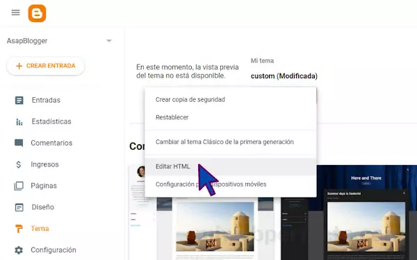 Paso 1: Inicie sesión en su Panel de control de Blogger y seleccione Plantilla/Tema y haga clic en Editar HTML .