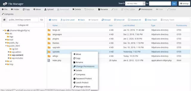 Busque la carpeta "Uploads", haga clic con el botón derecho y seleccione la opción Cambiar permisos.