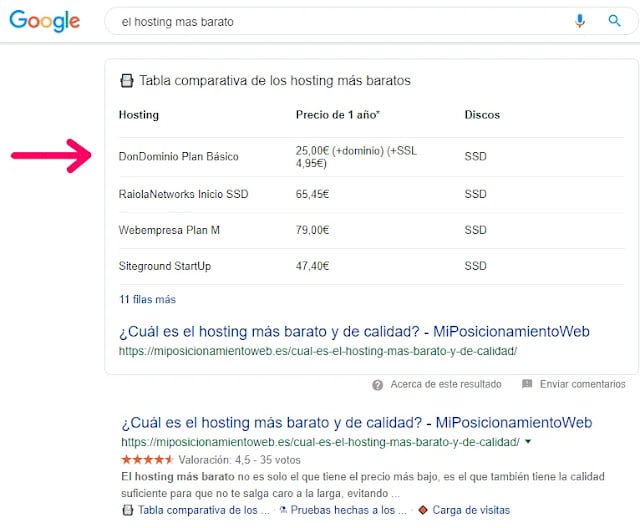 Cuando busqué en Google "el hosting más barato" y vi que la tabla de comparación de hosting aparecía en el primer resultado, la mejora de SEO en la página fue actualizar mi artículo sobre hosts baratos y agregar una tabla de comparación para intentar aparecer en esta posición.